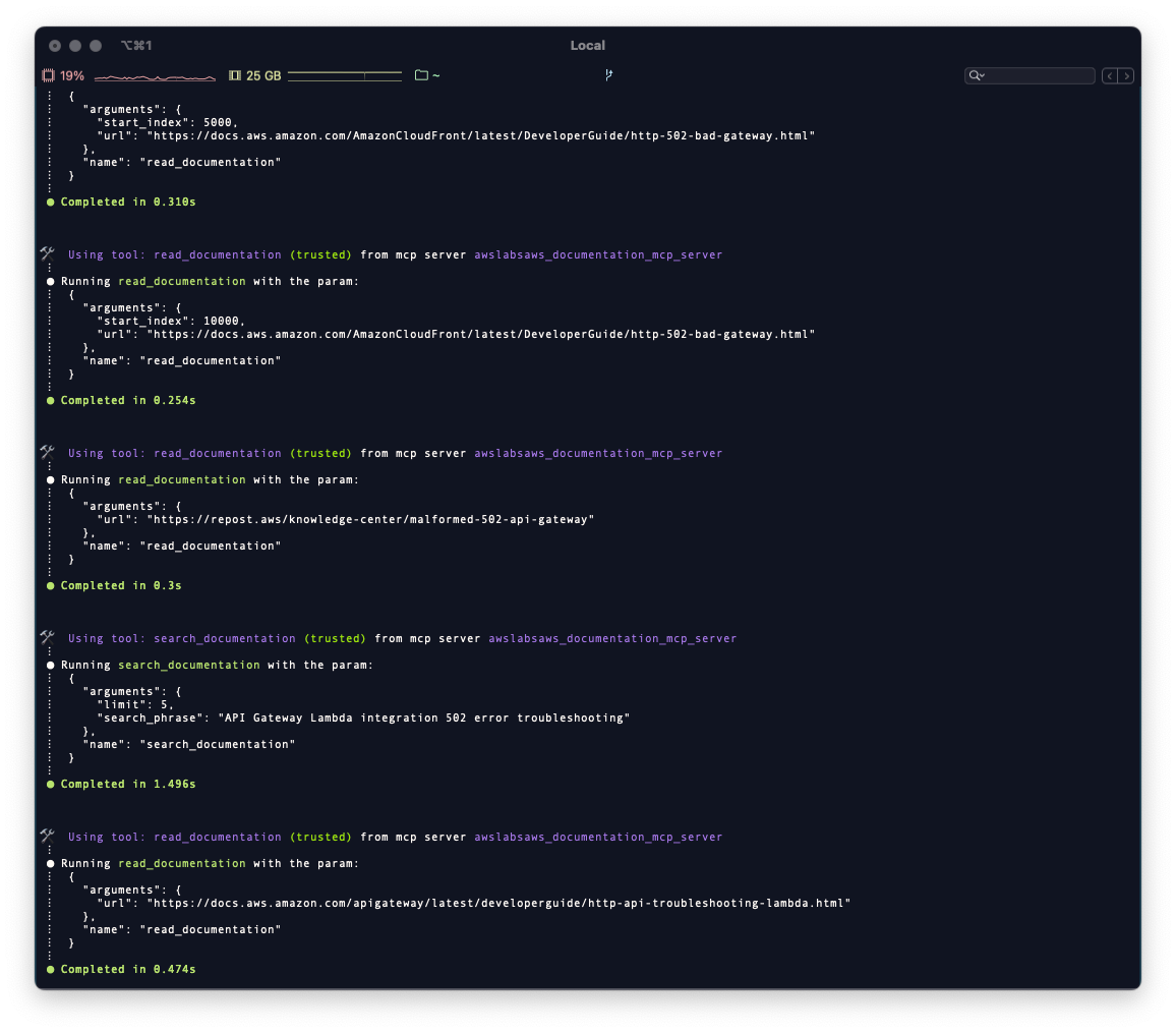 aws api gateway에서 502 bad gateway가 발생하는 문제에 대해서 질문하면 🛠️ Using tool: search_documentation from mcp server awslabsaws_documentation_mcp_server과 같이 내가 추가한 mcp서버를 사용하는 것을 볼 수 있다.